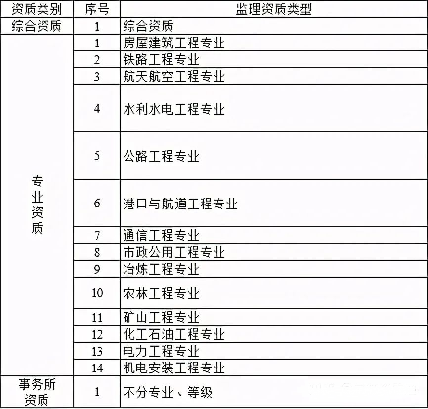 工程监理资质包含综合资质,房屋建筑工程专业、铁路工程专业、水利水电工程专业、公路工程专业、港口与航道工程专业、机电安装工程专业等14项专业资质,事务所资质等。